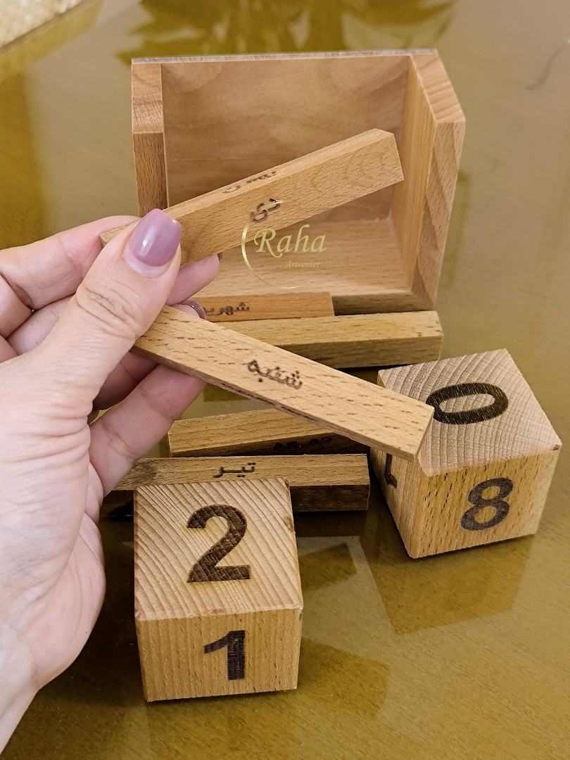 تقویم چوبی رومیزی پازلی مکعبی، دارای ماه شمسی، ایام هفته و تاریخ