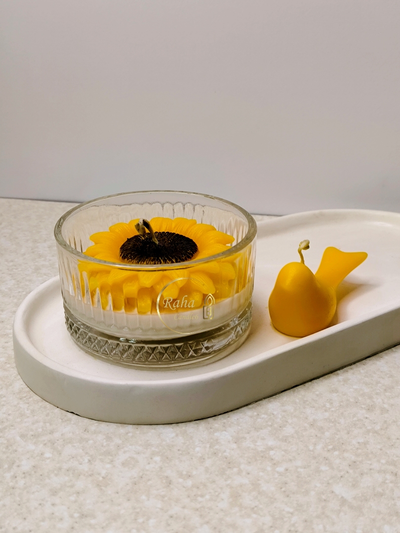 این مجموعه شمع، ترکیبی خلاقانه از زیبایی طبیعی و طراحی هنری است. شات شیشهای شامل گل آفتابگردان واقعی است که جزئیات و رنگ طبیعی گل را حفظ کرده و جلوهای دلنشین به محیط میبخشد. شمع دوم با پرنده زرد، حس شادابی و انرژی مثبت را به فضا اضافه میکند. طراحی مینیمال و در عین حال جذاب، باعث میشود این مجموعه با انواع دکوراسیون منزل هماهنگ باشد.